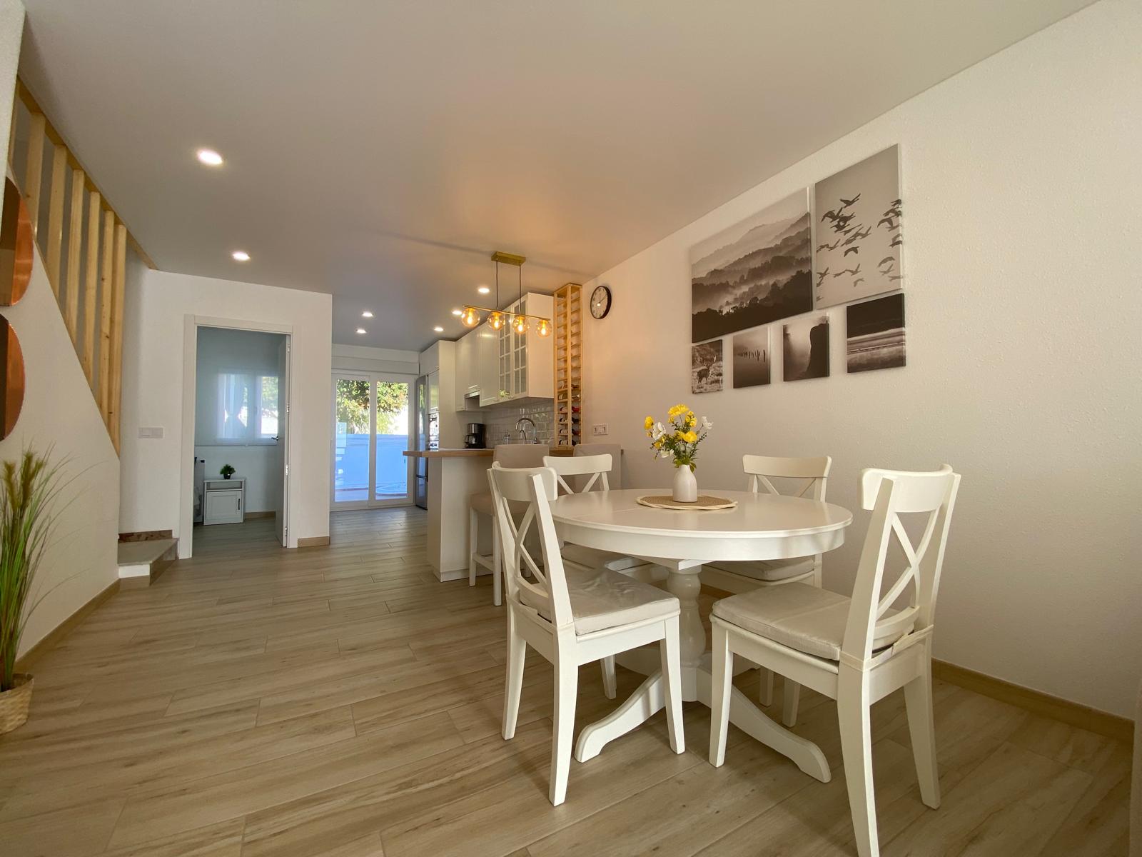 Completely renovated townhouse where everything has been replaced with brand-new installations: electrical wiring, plumbing, air conditioning units, windows, and doors. Only high-quality materials have been used.The house is fully furnished and equipped with all appliances ready to move into.Everything shown in the photos is included.The house has two floors.Ground floor:Spacious and bright livingdining room integrated with the kitchen1 bedroom1 guest toiletFront terrace of 20 m² ideal for enjoying your morning coffee or relaxing at sunset, sun all dayRear terrace of 30 m² with access to the patio and storage room perfect for barbecues, outdoor dining, or a childrens play areaFirst floor:2 bedrooms with built-in wardrobes and access to their own terraces1 bathroom with shower10 m² terrace ideal for sunbathing or relaxing in privacy15 m² terrace overlooking the park and the communal swimming poolSwimming pool: CommunalLocation: Excellent quiet area yet close to the town centre and the beaches.